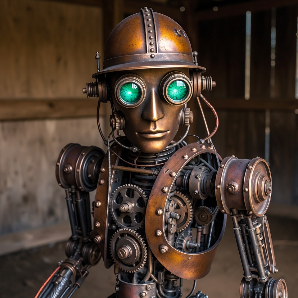 automaton, barn, brass robot, cyberpunk, gears, goggles, green eyes, helmet, isolated background, mechanical robot, metallic face, robot, rustic barn, sci-fi robot, steampunk, vintage robot, wooden barn, steampunk robot