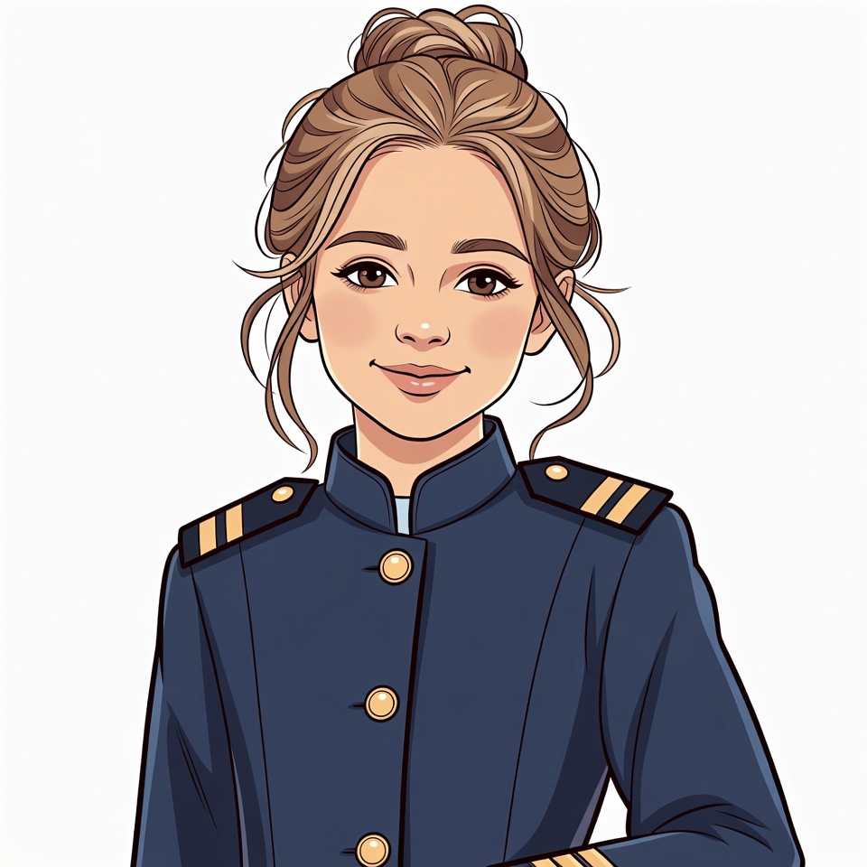 A young girl with light brown hair in a bun smiles at the viewer. She wears a navy blue uniform jacket with gold buttons and epaulets. The illustration is on an isolated white background.