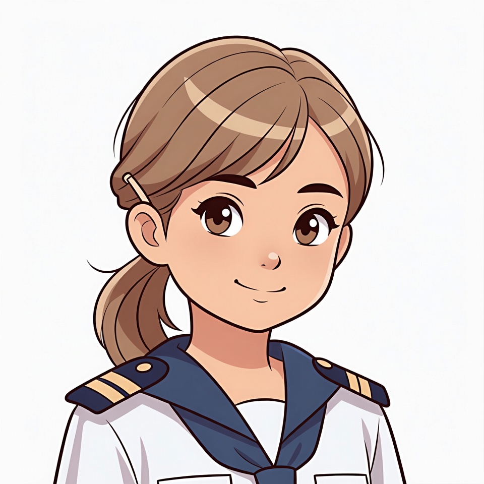 Asian, brown hair, cartoon, cute, female, girl, gold epaulets, illustration, isolated background, large eyes, navy uniform, ponytail, sailor uniform, smiling, white collar, anime girl