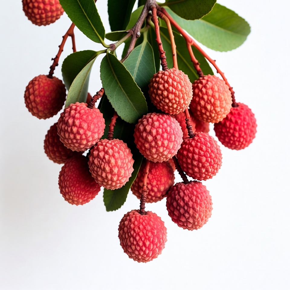 bumpy fruit, exotic fruit, fresh lychee, fruit cluster, green leaves, hanging lychees, isolated fruit, lychee branch, lychee fruit, lychees, red lychee, ripe lychees, tropical fruit, white background, lychee
