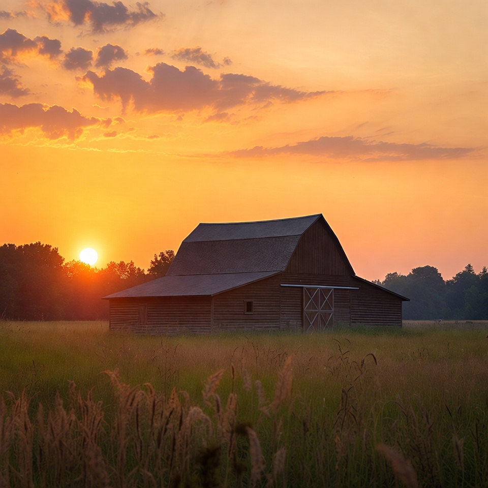 A rustic wooden barn with a gabled roof stands silhouetted against a vibrant orange sunset sky filled with scattered clouds. Tall grass sways in the foreground field, and trees frame the edges of the scene. The sun glows brightly just above the horizon.