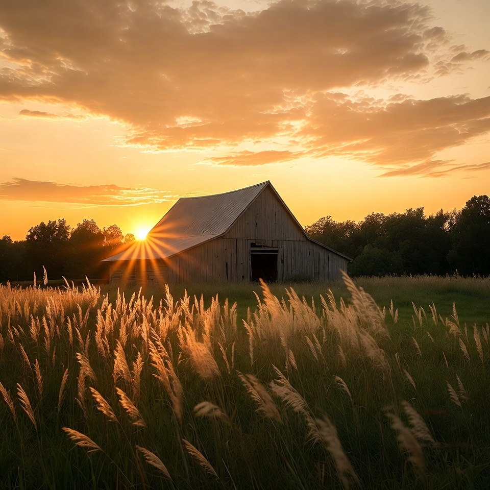 A weathered wooden barn with a metal roof stands in a field of tall golden grass at sunset. The sun shines brightly behind the barn, casting sun rays through scattered clouds. Surrounding trees frame the rural scene under a colorful sky.