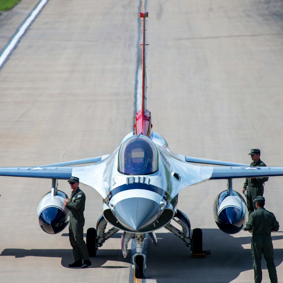 F-16 fighter, US Air Force, White, aircraft inspection, airplane, airshow jet, aviation, aviator hats, blue canopy, fighter jet, flight suits, green uniforms, ground crew, jet engines, male, men, military jet, pilots, red accents, runway, tarmac, white jet, Thunderbirds jet