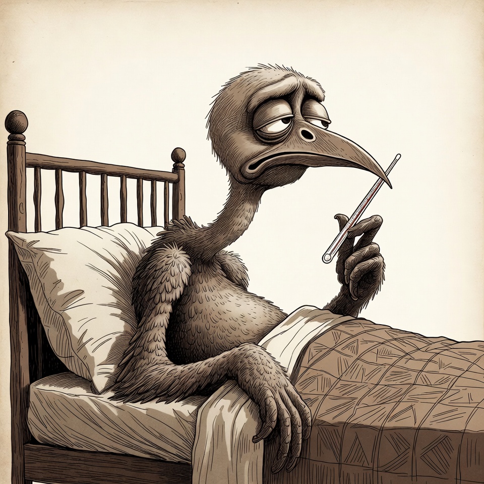 A cartoon ostrich with a sad expression lies in a wooden bed, holding a thermometer in its beak. It is covered with a blanket and white pillow, appearing ill. The illustration features a sepia-toned, sketchy style on an isolated background.