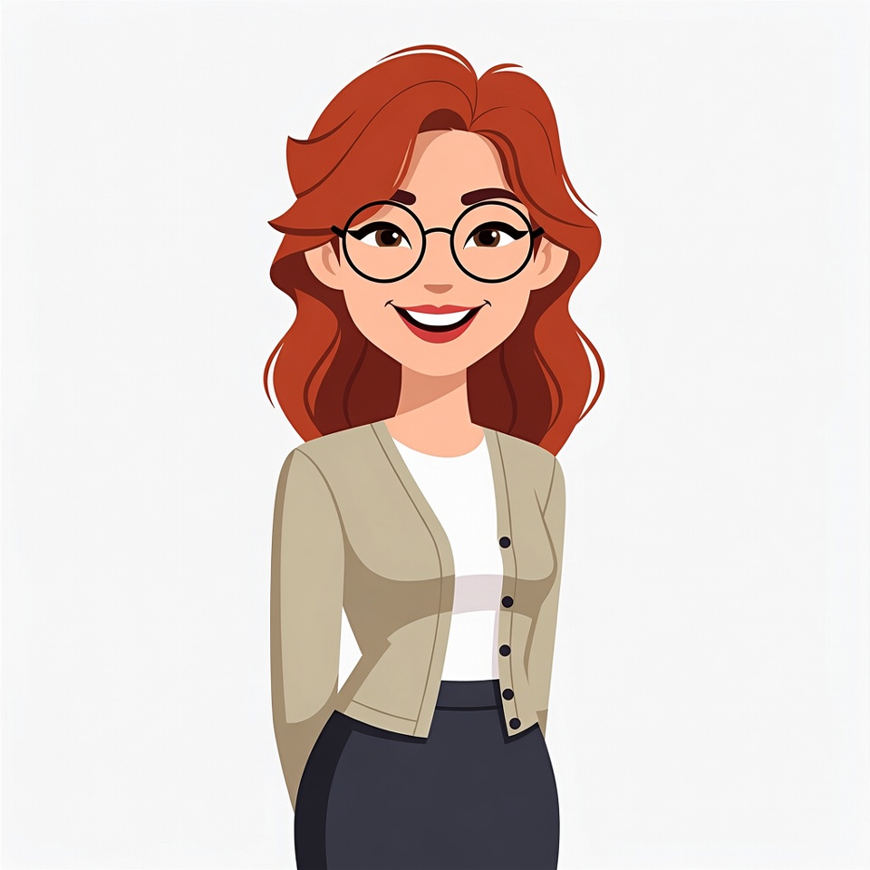A cartoon illustration of a young woman with long wavy red hair and round glasses smiles happily. She wears a white blouse under a beige cardigan and a black skirt. She stands with hands behind her back on a white background.