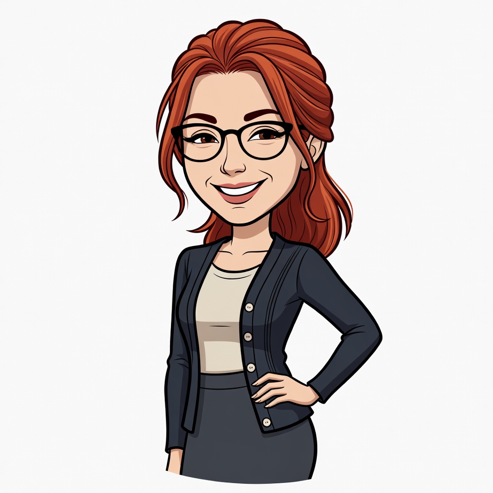 A cartoon illustration of a young woman with long red hair styled in a ponytail, wearing black-framed glasses and smiling confidently. She has on a navy blue blazer over a white top and matching skirt, with her hand on her hip. The figure stands against a white isolated background.