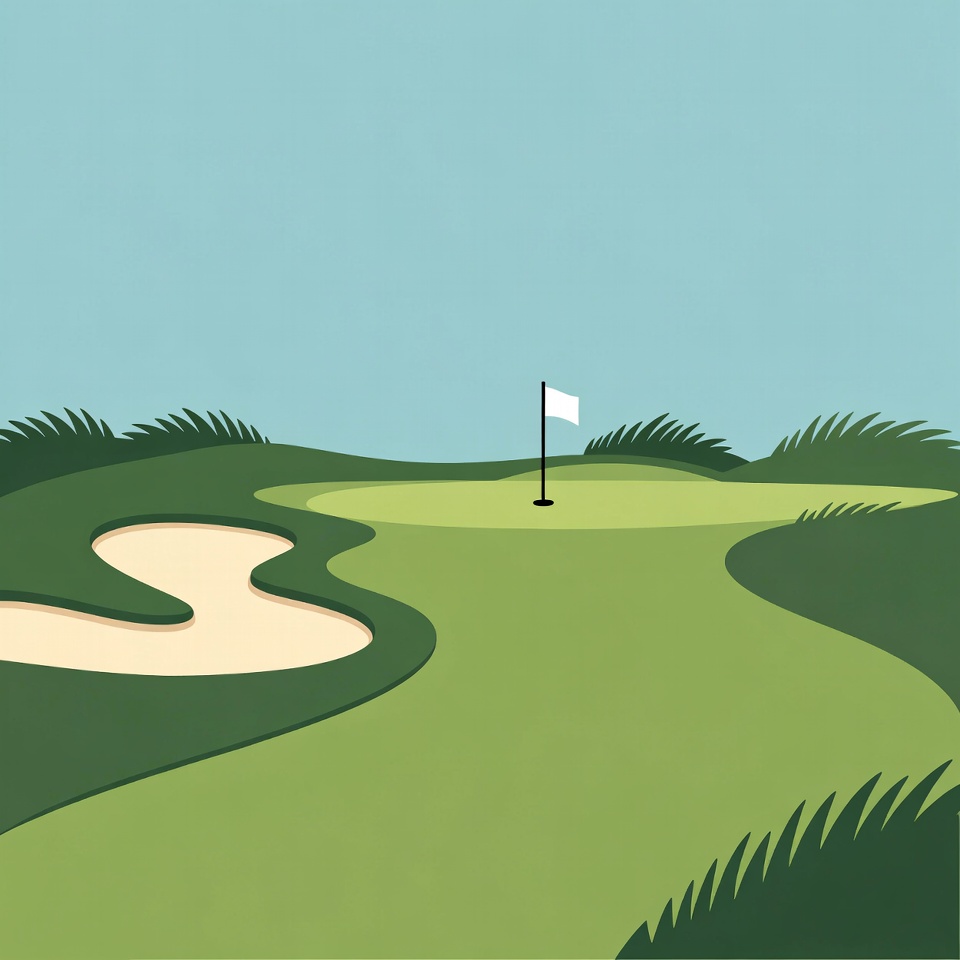A simple illustration of a golf course green features lush green grass curving around a white sand bunker. A flagstick with a white flag stands in the center of the green. Surrounding grassy hills and a clear blue sky complete the isolated scene.