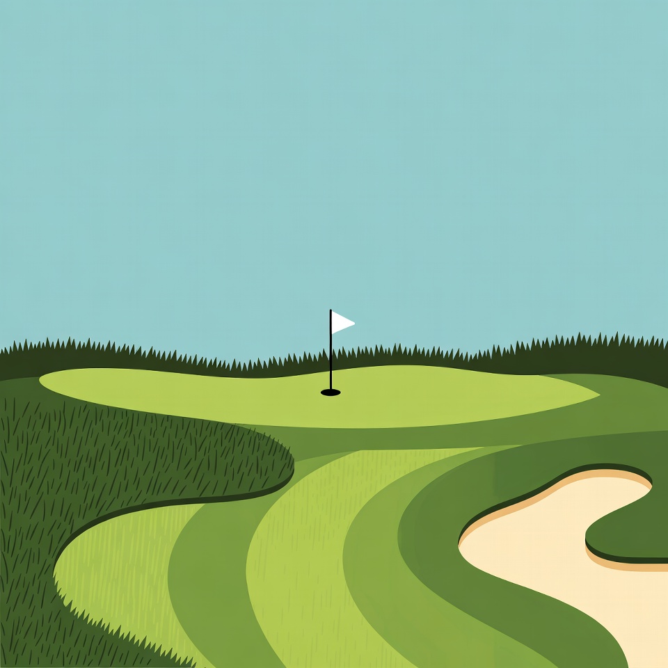 A colorful illustration depicts a golf course green with a white flag on a pole. A curved sand trap borders the edge of the green, surrounded by grassy hills. The scene features a clear blue sky above.