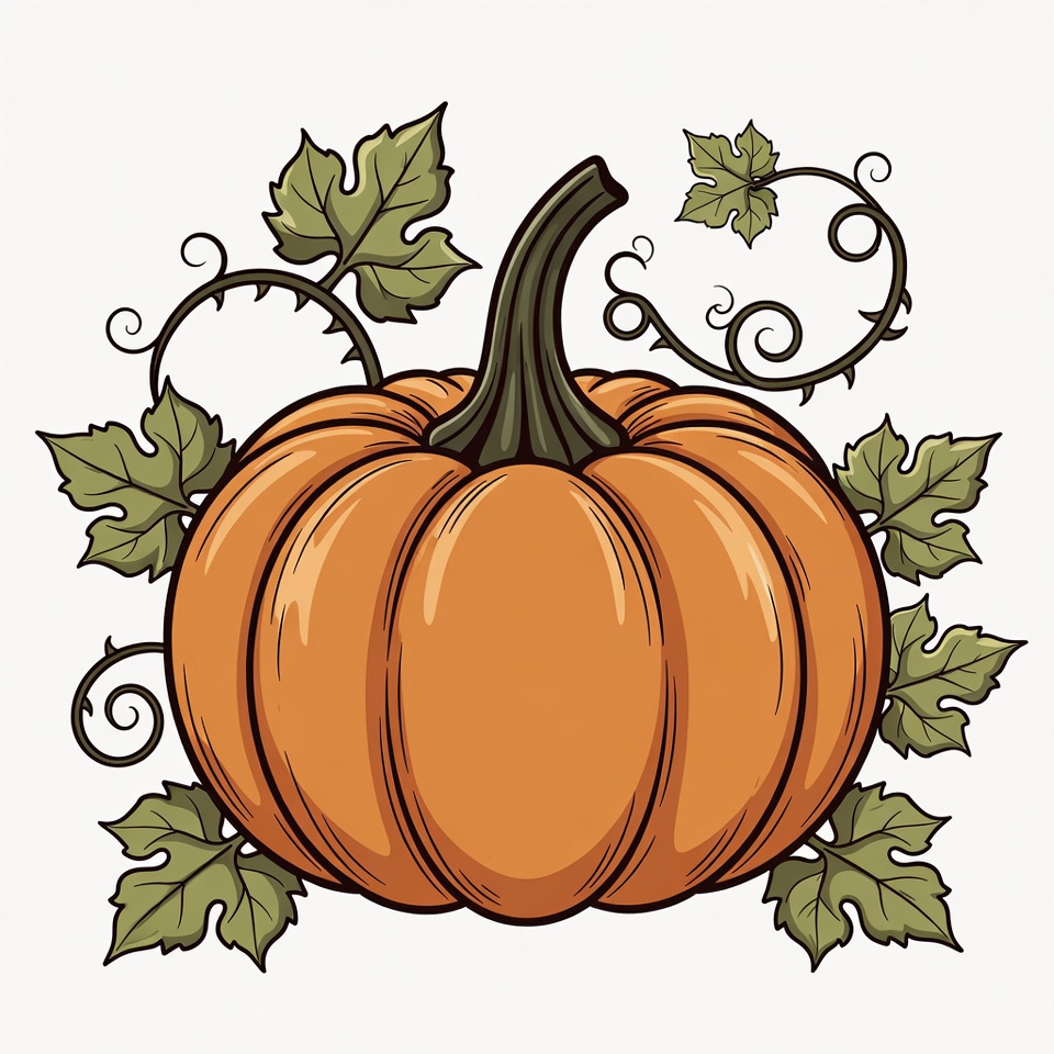 A vibrant orange pumpkin sits centered on a white background, surrounded by curling green vines and broad green leaves. The pumpkin features a dark stem and smooth, glossy surface with subtle shading. The illustration has a detailed, hand-drawn style perfect for fall decorations.