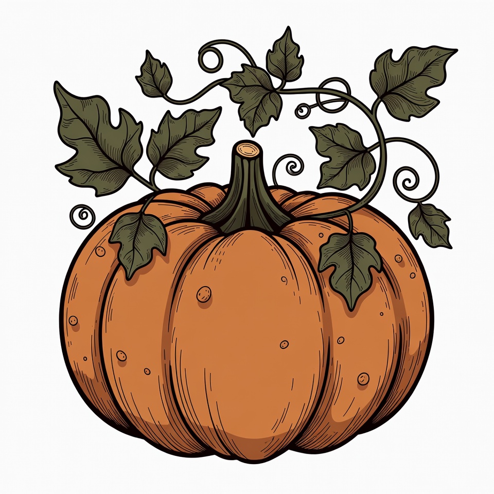 A hand-drawn orange pumpkin features a textured surface and green stem. Curly vines and broad leaves extend from the top, arranged in a symmetrical design. The illustration is set against a white isolated background.