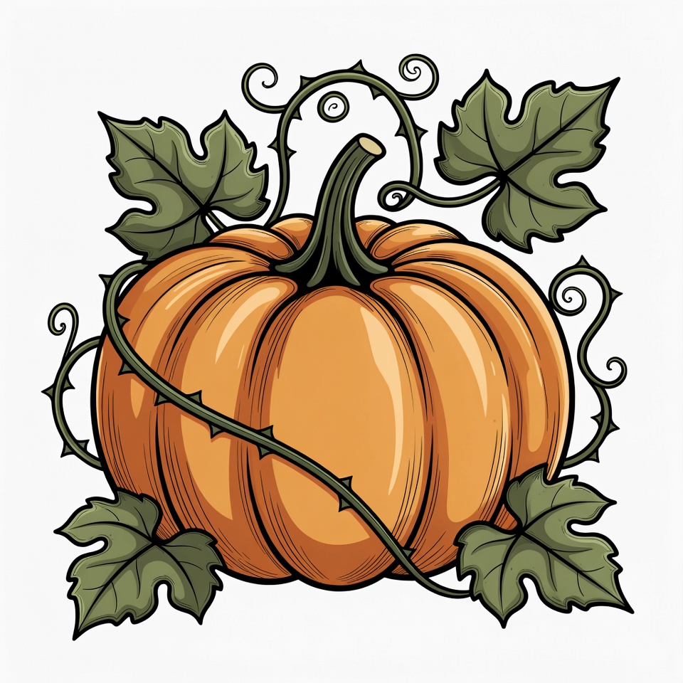 A vibrant orange pumpkin illustration features a sturdy stem and is surrounded by curly green vines and broad green leaves. The artwork has a clean white background, emphasizing the detailed outlines and rich colors. The pumpkin appears plump and textured, typical of Halloween or autumn themes.