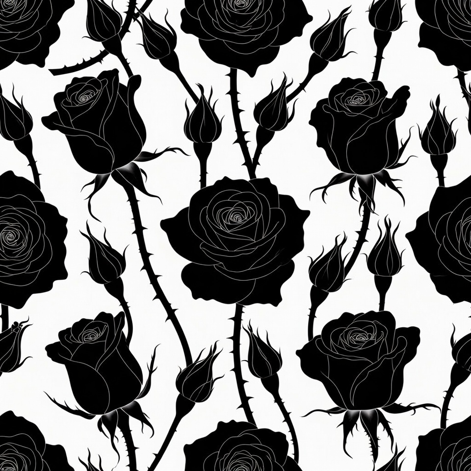 A seamless pattern features black silhouette roses with buds and thorny stems on a white background. The roses are arranged in a repeating floral design with elegant outlines. The illustration creates a continuous, tileable texture.