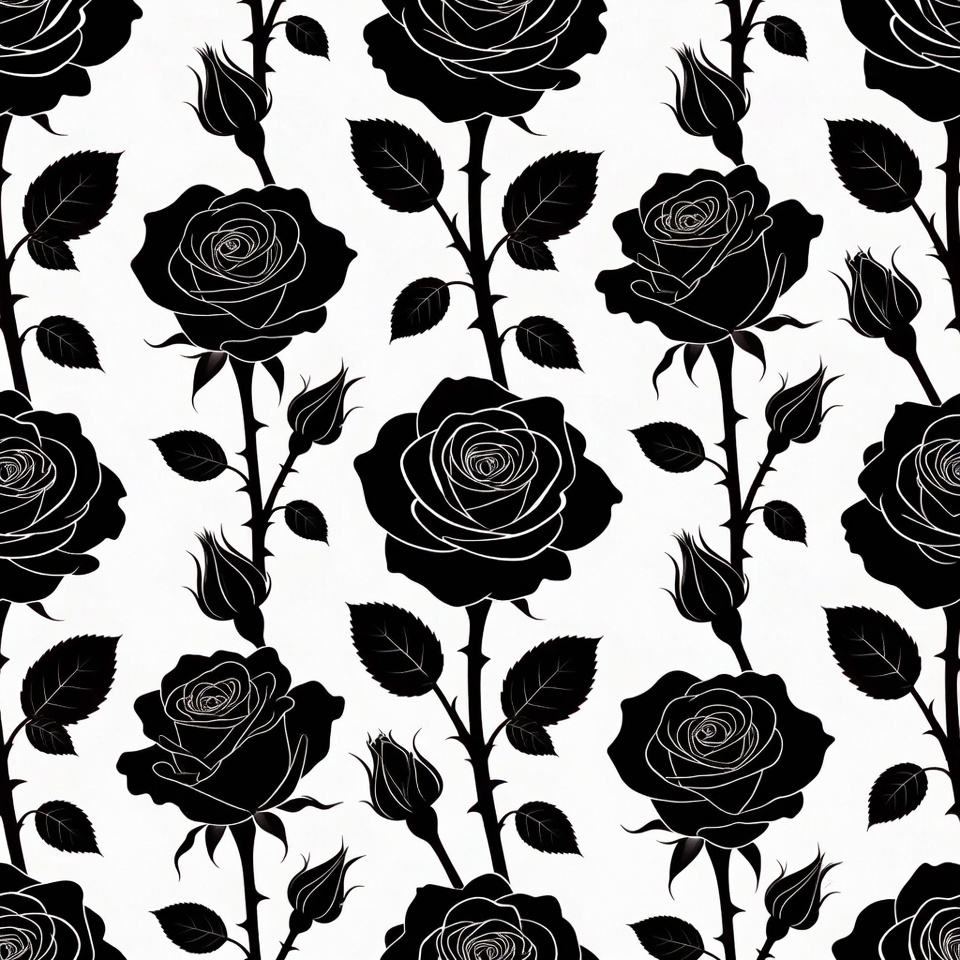 A seamless pattern features black outline roses with stems, leaves, and buds on a white background. The roses are arranged in a repeating floral design. The illustration uses simple black line art for a classic look.