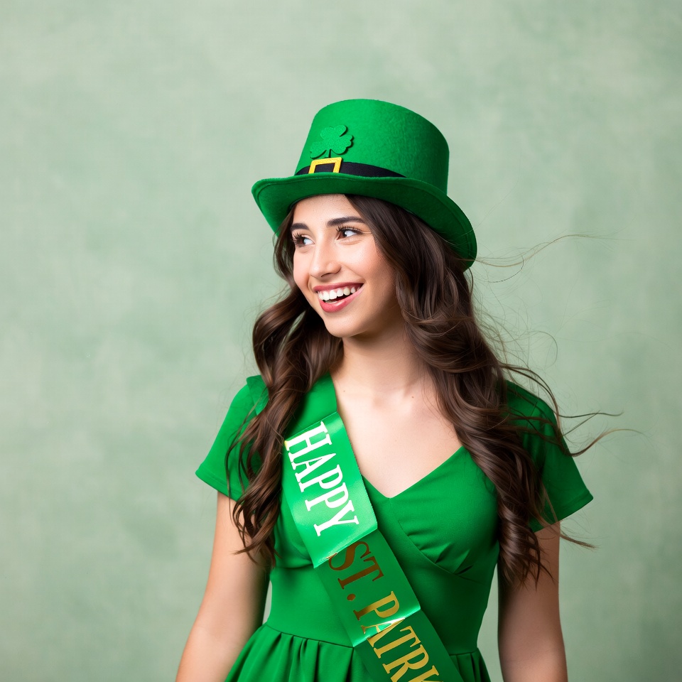 A smiling young woman with long wavy brown hair wears a green leprechaun hat and a form-fitting green dress. She has a gold-lettered 'Happy St. Patrick' sash over her shoulder and stands against a light green background. Her expression is joyful as she turns her head slightly.