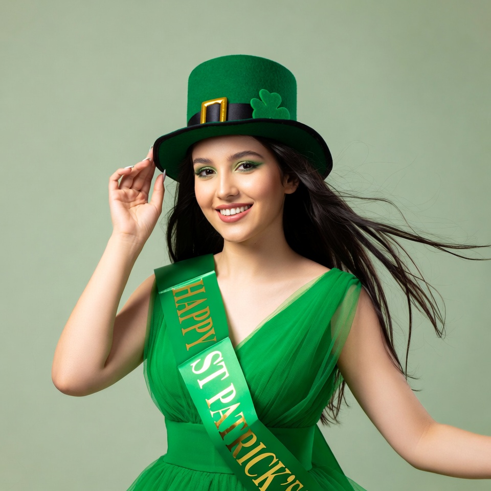 A smiling woman with long dark hair wears a green top hat with a black buckle and shamrock, posing against a light green background. She has a wide green sash across her chest reading 'Happy St. Patrick's Day' in gold letters. Her green tulle dress flows as she lifts the brim of her hat with one hand.