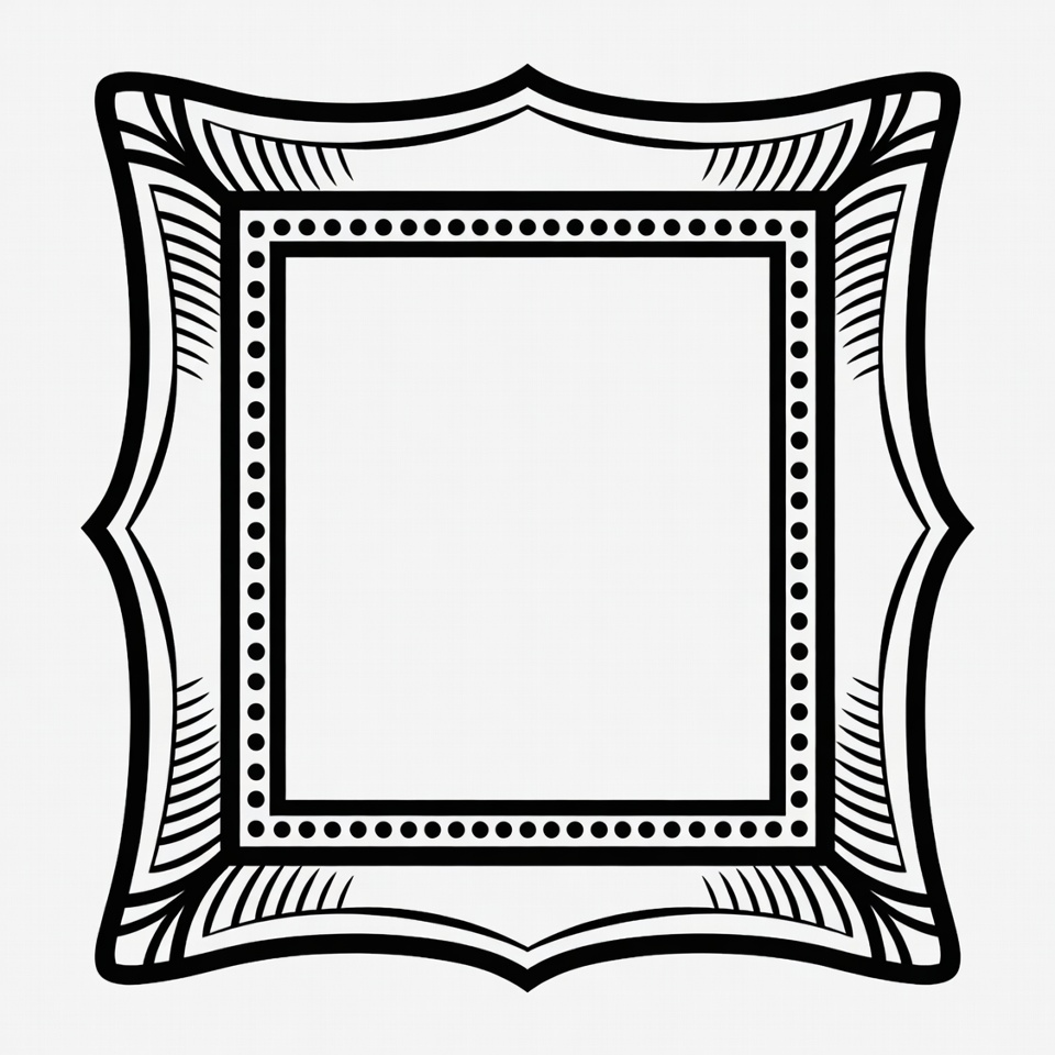 A detailed black line art frame with intricate corner flourishes and dotted inner borders. The square design features elegant curved extensions on each side. The interior is completely empty on a white background.