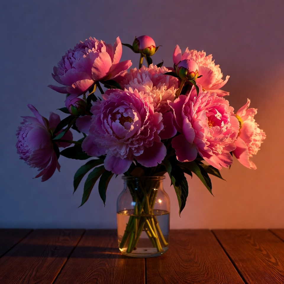 A bouquet of lush pink peonies with layered petals sits in a clear glass jar filled with water. The flowers feature green stems and buds, arranged on a wooden table. Soft purple and orange lighting illuminates the vibrant blooms against a dark background.