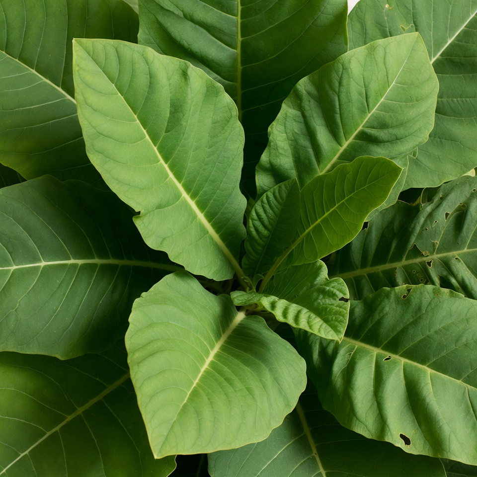 Nicotiana tabacum, botany, broad leaves, close-up, fresh foliage, garden plant, glossy leaves, green leaves, isolated background, large leaves, leaf cluster, nature, plant leaves, tobacco plant, top view, tropical plant, veined leaves, vibrant green, tobacco leaves
