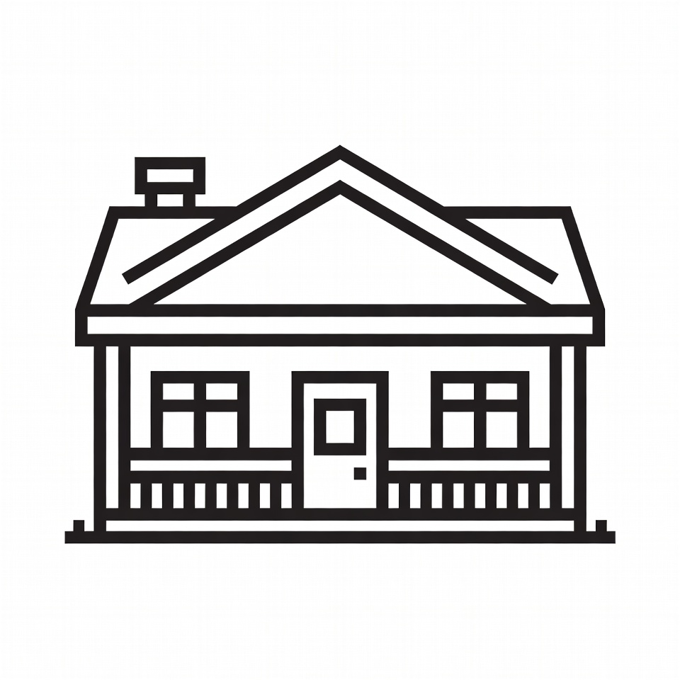 A simple black line drawing of a house features a gabled roof, chimney, and front porch with railing. The house has two windows and a central door on the porch. It is depicted on a white isolated background.