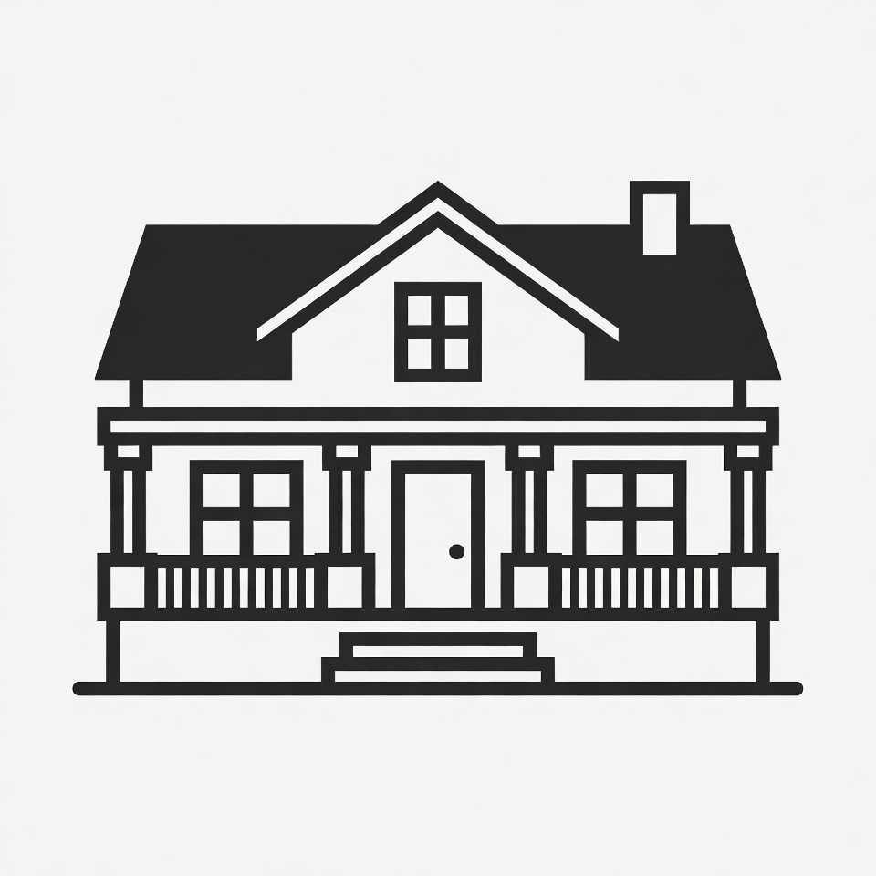A simple black line drawing of a two-story house features a gabled roof, chimney, and front porch with columns and railing. The house has multiple windows and a central front door. It is depicted on an isolated white background.