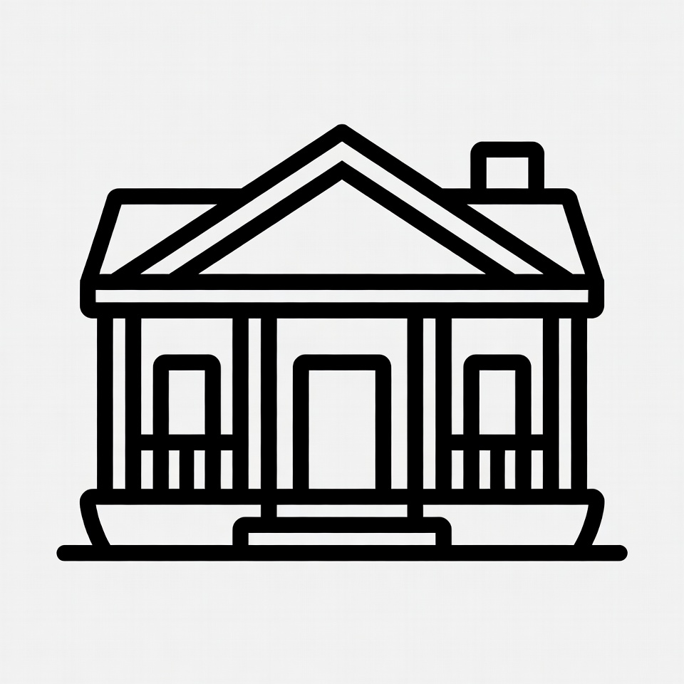 architecture, black lines, building, chimney, clipart, door, gabled roof, home, icon, illustration, isolated background, line art, outline, porch, railing, simple, steps, vector, windows, house