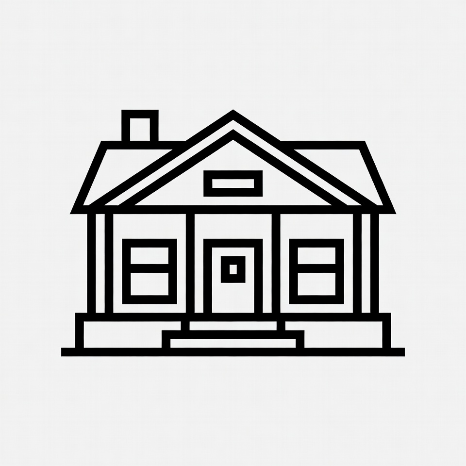 A simple black line drawing of a house features a gabled roof with a chimney, a central front door flanked by two windows, and a small porch. The illustration is rendered in a clean outline style on a white background. It depicts a classic house shape with straight lines and minimal details.