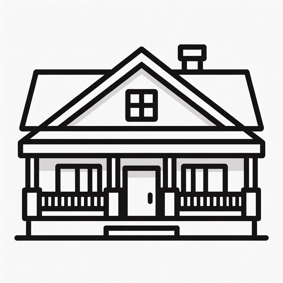 A simple black line illustration of a two-story house features a gabled roof with chimney, front porch with railing, and multiple windows. The central door is flanked by windows on the porch. The house stands on a flat base against a white background.