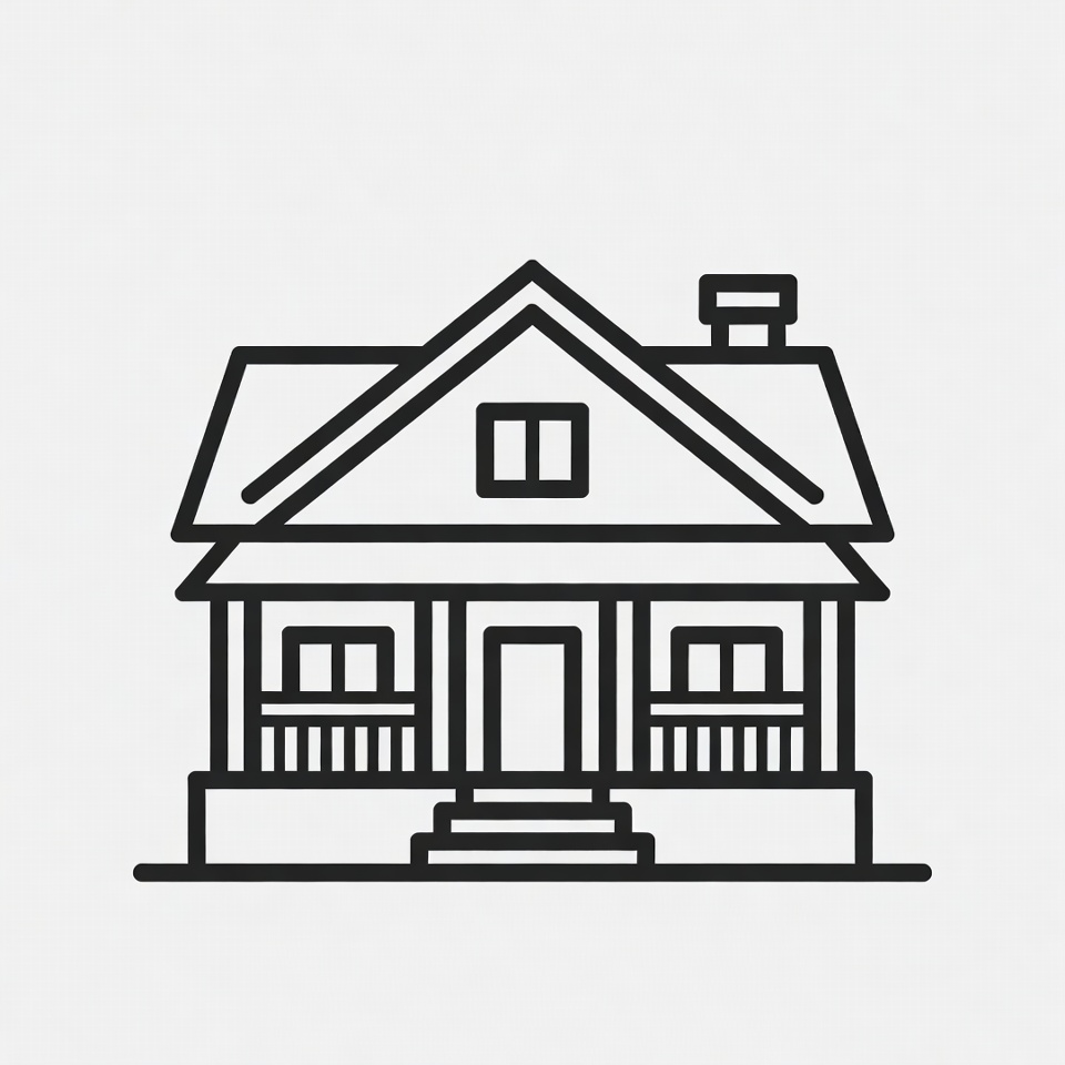A simple black line drawing of a two-story house features a gabled roof, chimney, and front porch with railings. The house has multiple windows and a centered front door with steps leading up to it. It stands isolated on a plain background.