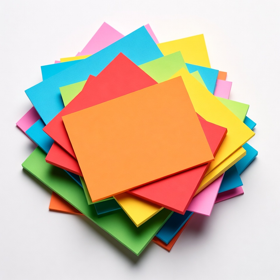A stack of vibrant square papers in various colors including red, yellow, blue, green, pink, and orange sits on a white background. The papers are neatly piled with edges slightly askew, creating a dynamic arrangement. Each paper is blank and uniform in size.
