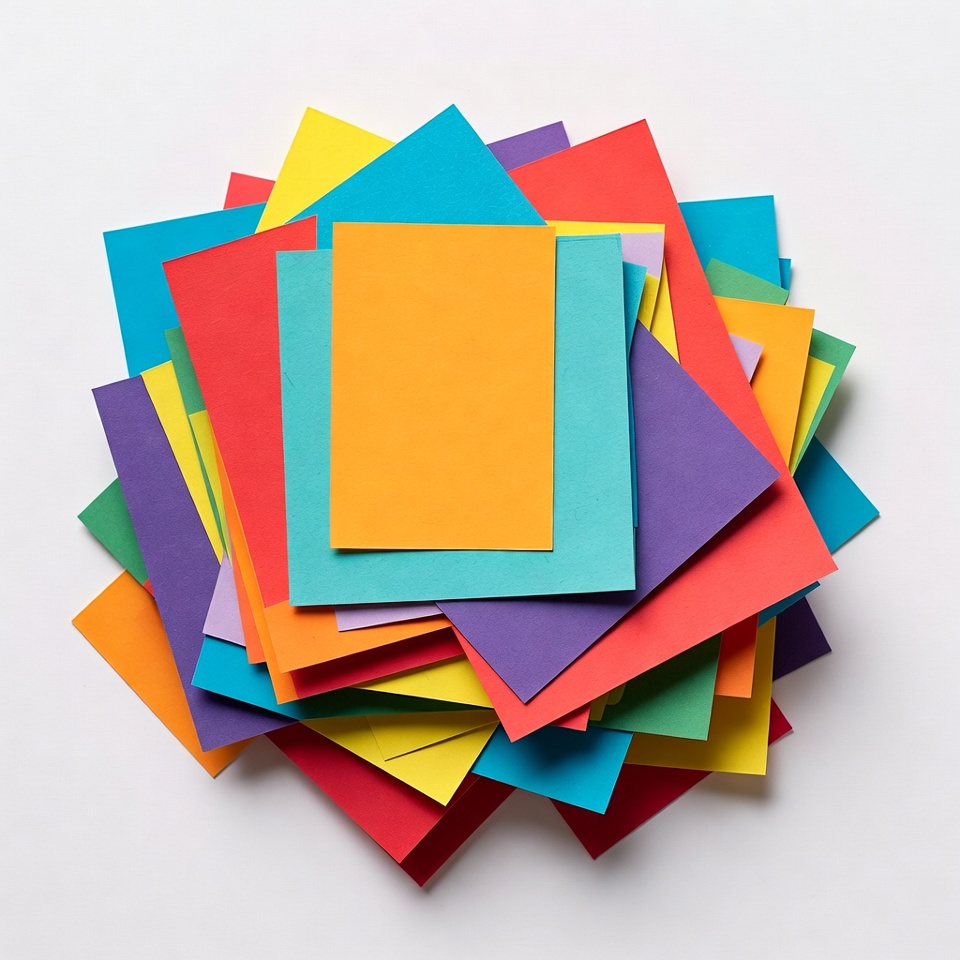 art supplies, blue paper, bright colors, colored sheets, colorful paper, craft paper, green paper, isolated background, orange paper, paper pile, paper stack, purple paper, red paper, top view, vibrant hues, white background, yellow paper, construction paper