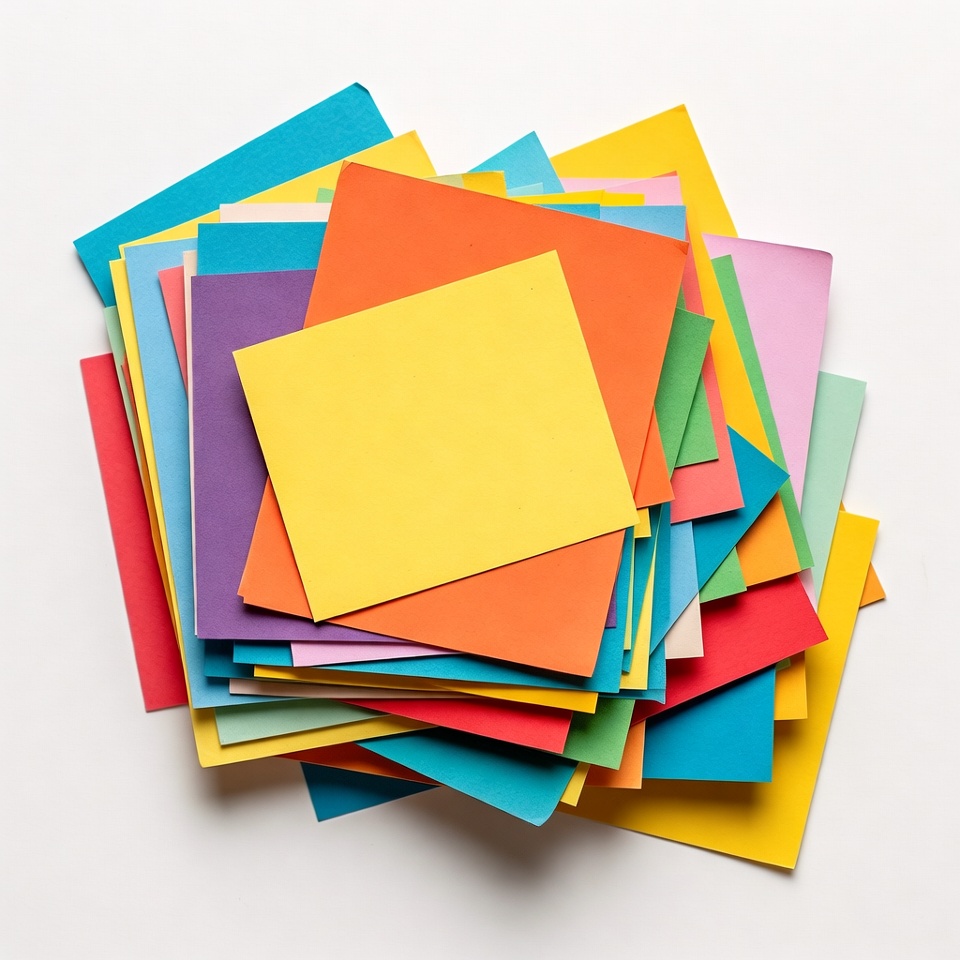 art supplies, assorted colors, blue paper, bright colors, colored paper, colorful, craft paper, craft supplies, green paper, isolated background, orange paper, paper sheets, paper stack, purple paper, rainbow paper, red paper, square sheets, stack, top view, vibrant colors, white background, yellow paper, construction paper