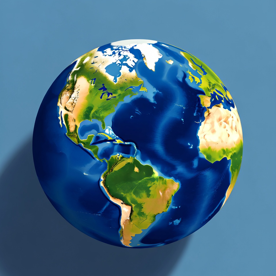 A detailed 3D illustration of Earth shows the Western Hemisphere with North and South America, the Atlantic Ocean, and parts of Europe and Africa. The planet features realistic blue oceans, green continents, white polar ice caps, and atmospheric clouds. It is centered against a solid blue background with a subtle shadow.