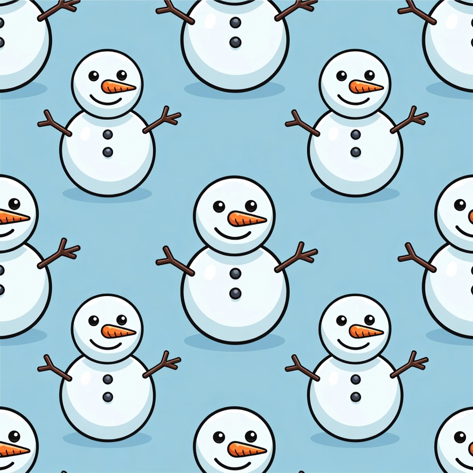 A seamless repeating pattern features multiple cartoon snowmen on a light blue background. Each snowman has a white body, black eyes, orange carrot nose, stick arms, and a cheerful smile. The illustration is simple and festive, ideal for winter designs.