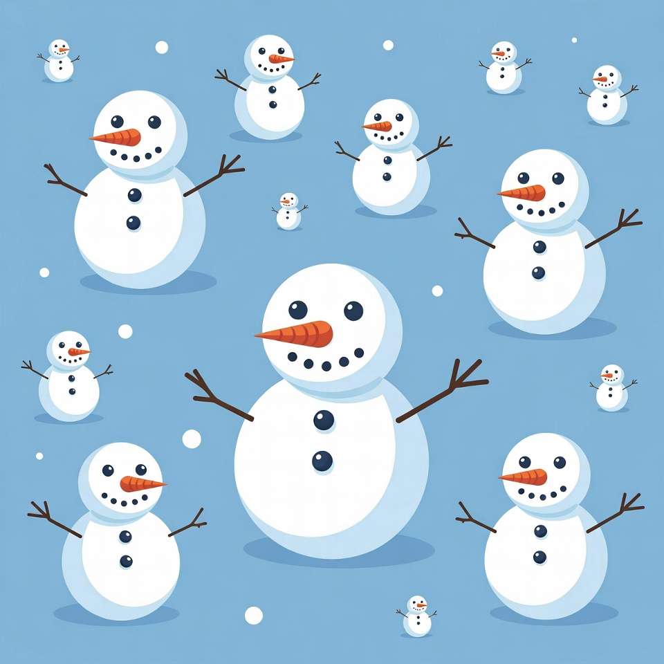 A collection of white snowmen in various sizes stands on a solid blue background. They feature orange carrot noses, black eyes, and stick arms, with some snowflakes scattered around. The illustration has a simple, cartoonish style.