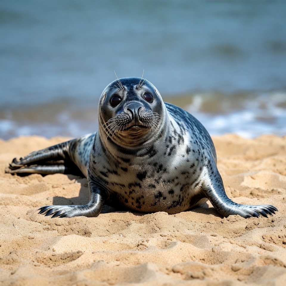animal, beach, coast, cute animal, flippers, gray seal, harp seal, isolated background, large eyes, marine life, nature, ocean, sand, sea mammal, seal pup, spotted fur, waves, whiskers, wildlife, baby seal