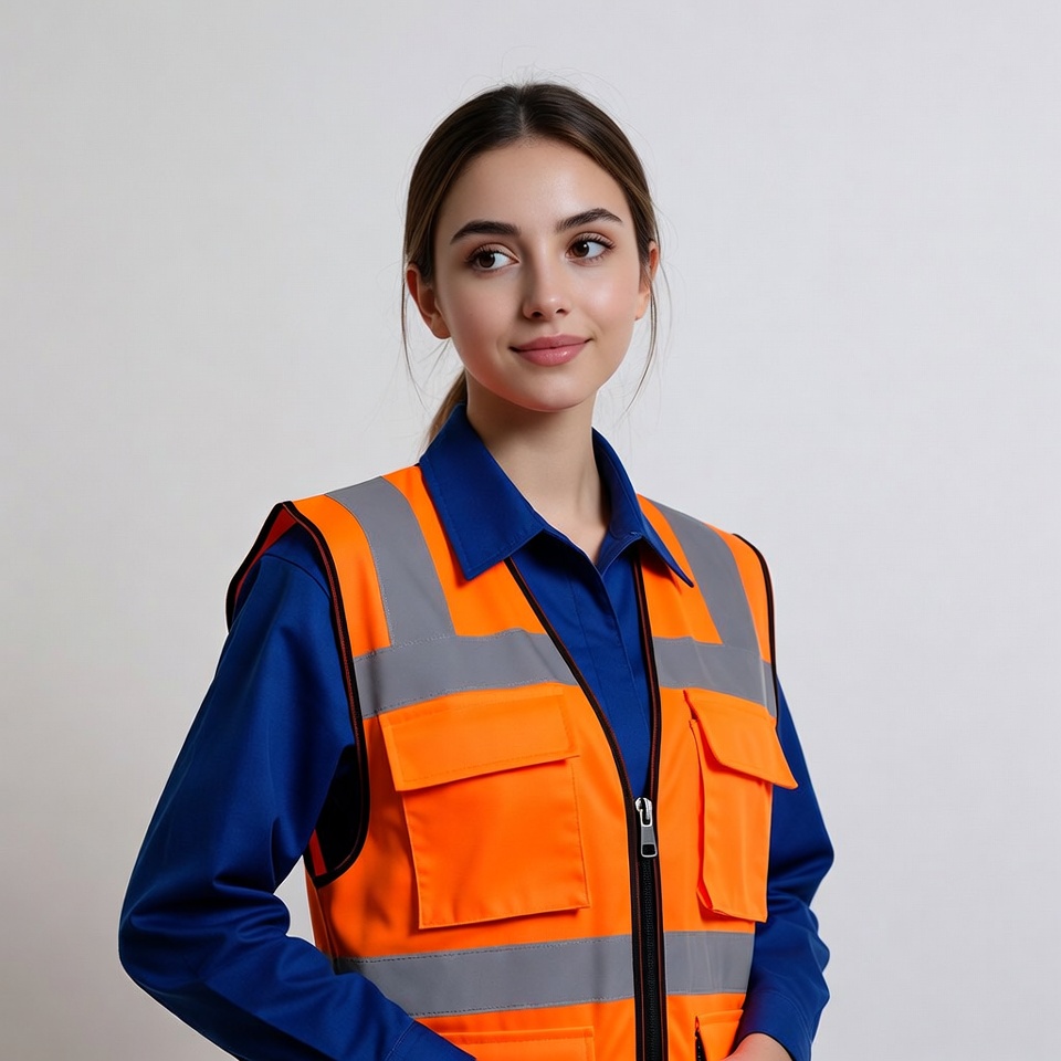 A young woman with dark hair tied in a ponytail wears an orange high-visibility safety vest over a blue collared shirt. She stands confidently against a plain white background, smiling slightly at the camera. The vest features reflective silver stripes and pockets.