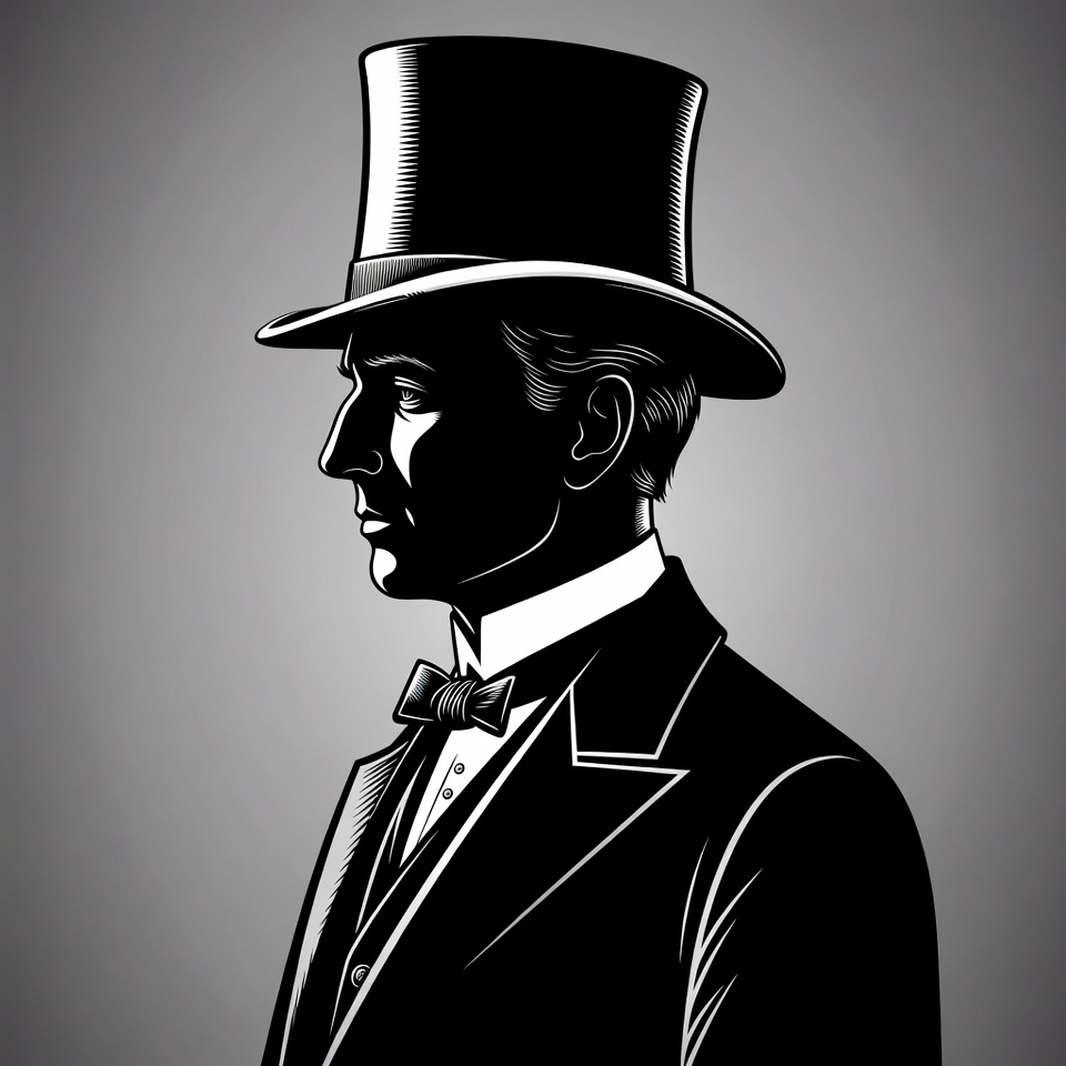 black and white, bow tie, classic style, collar, dapper man, elegant attire, engraving style, formal hat, formal wear, gentleman, hat, illustration, isolated background, line art, mens fashion, profile view, retro fashion, side profile, silhouette, suit, top hat, tuxedo, vintage, man