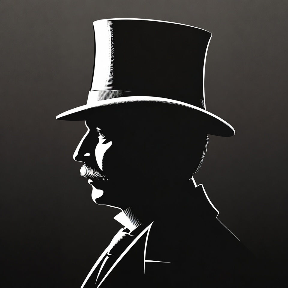 A black and white line art illustration depicts a man's profile silhouette wearing a tall top hat and formal suit. He has a prominent mustache and stands against a dark gradient background. The image is rendered in a minimalist vector style.
