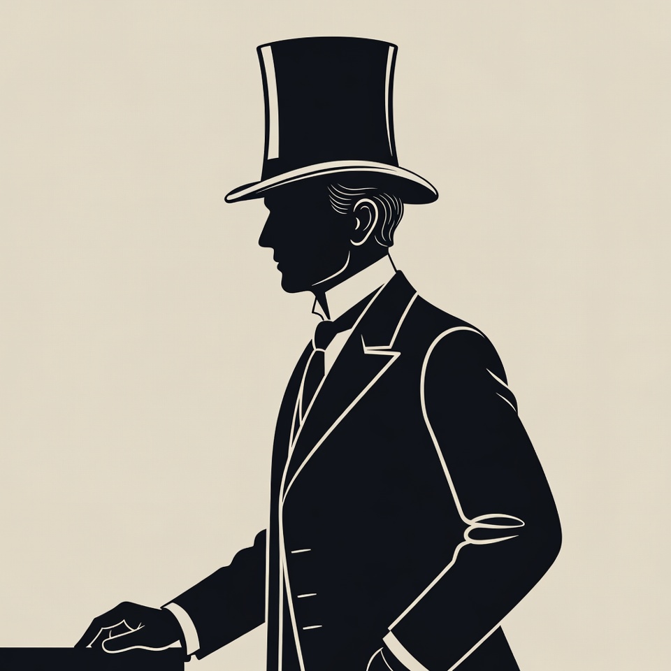 A black silhouette illustration of a man in profile view wearing a tall top hat, tuxedo jacket, bow tie, and white shirt. He stands with his right hand resting on a surface and gazes to the side. The image features a simple beige background with clean line art.