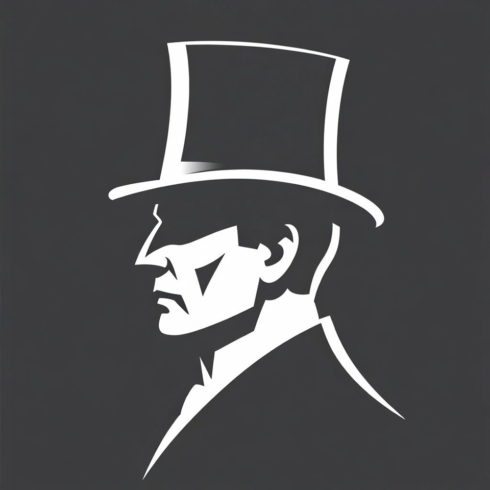 A black and white silhouette illustration of a man in profile wearing a tall top hat and formal suit. The design features sharp outlines against a dark gray background. The man's face shows a serious expression with defined jawline and hair.