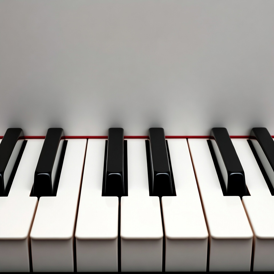 A close-up view of black and white piano keys on a grand piano. The keys are sharply detailed against a plain gray background. The image highlights the alternating pattern of ebony black and ivory white keys.