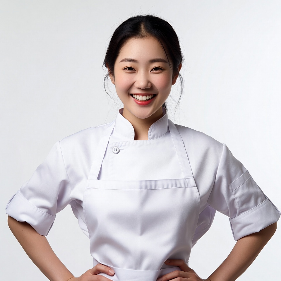 A young Asian woman with black hair tied back wears a white chef uniform and apron. She stands with arms crossed and a bright smile on her face. The image is set against a plain white background.