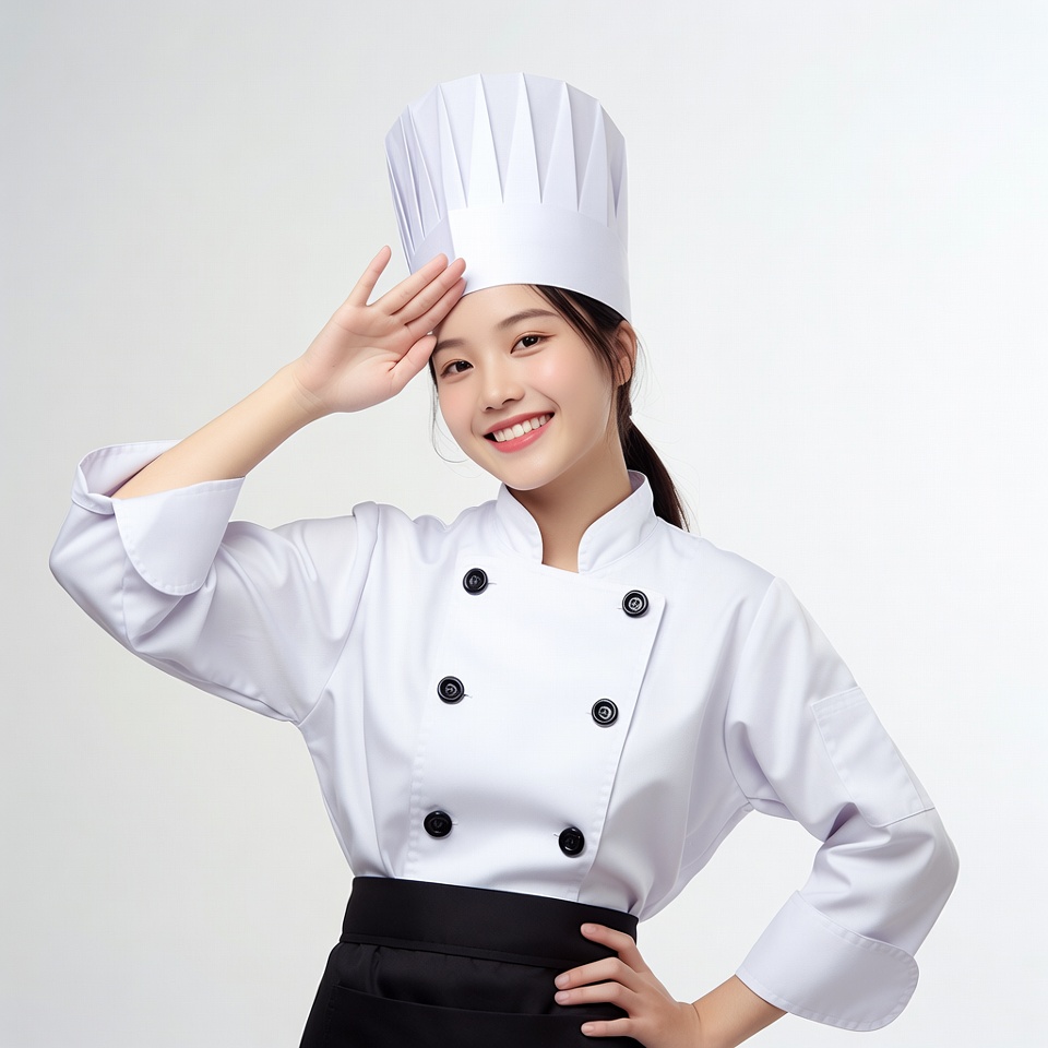 A young Asian woman wearing a white chef uniform and tall chef hat stands confidently against a white background. She smiles brightly while saluting with her right hand to her forehead. Her ponytail is neat, and she has one hand on her hip.