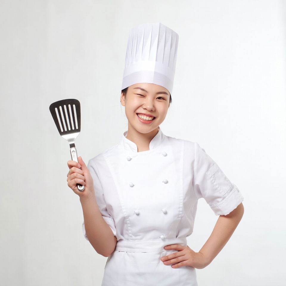 A smiling Asian woman wearing a white chef's uniform and tall chef's hat holds a black spatula in her right hand. She stands confidently with her left hand on her hip against a plain white background. Her uniform features double-breasted buttons and short sleeves.