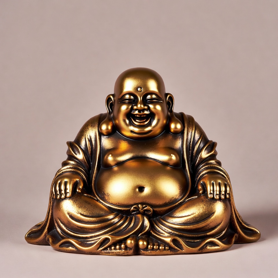 Asian statue, Buddha statue, Buddhist statue, bronze statue, figurine, golden Buddha, happy Buddha, isolated background, joyful expression, meditation pose, plump Buddha, robes, sculpture, smiling Buddha, Laughing Buddha