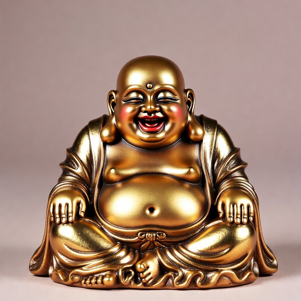 Asian statue, Buddha statue, Buddhist figure, bald head, flowing robes, gold color, golden statue, happy Buddha, isolated background, meditation pose, plump Buddha, red dot, seated Buddha, smiling Buddha, Laughing Buddha