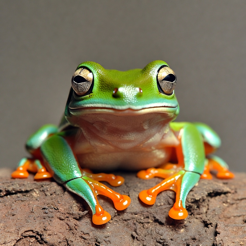 A vibrant green tree frog with large golden eyes sits on a wooden branch. It has bright orange toes and glossy skin with subtle markings. The frog faces forward with a slight smile-like expression.