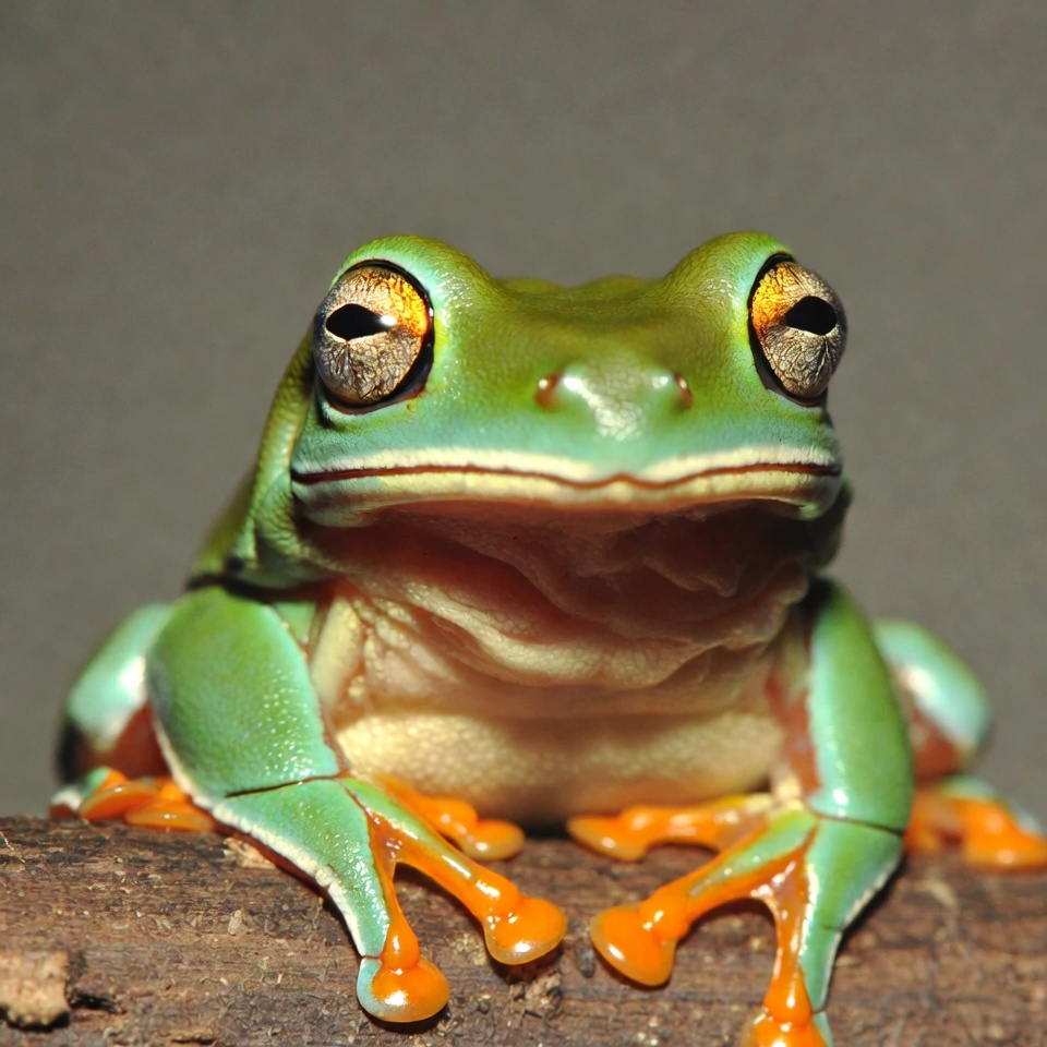 A vibrant green tree frog with orange toes sits on a wooden branch. It has large golden eyes with black pupils and a white underbelly. The frog's mouth is slightly open, showcasing its detailed skin texture.