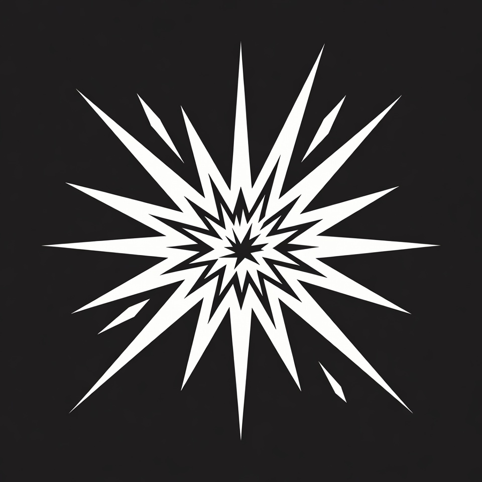 A bold white starburst graphic with sharp, radiating spikes is centered on a solid black background. The design features intricate layered points creating a dynamic explosion effect. It appears as a simple vector illustration suitable for isolated use.