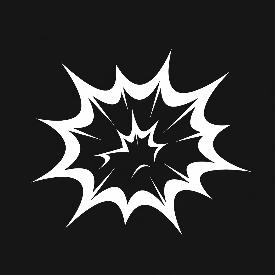 A bold white explosion graphic with sharp, jagged spikes radiates outward on a solid black background. The design features symmetrical star-like points and curved accents for a dynamic burst effect. It is a simple vector-style illustration isolated on black.